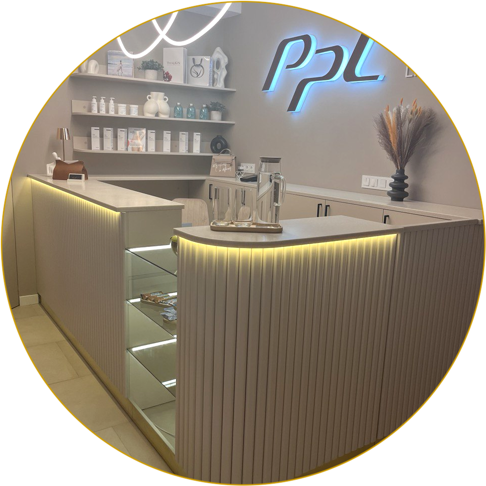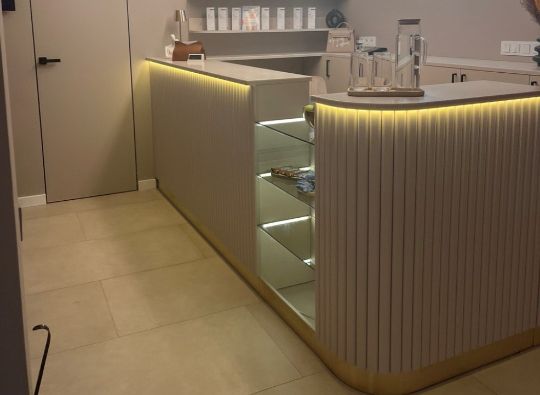 Стойки ресепшн по индивидуальным размерам из МДФ, ЛДСП, HPL с интеграцией розеток и подсветки
